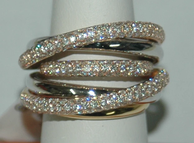 Sophisticated three-tone 18K gold ring featuring 2.29 carats of round diamonds, intertwining bands create a bold, contemporary statement piece for the discerning jewelry lover.